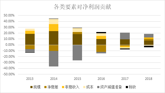 从2018年中各要素对利润的贡献程度来看,前三大要素主要为规模、资产减值准备与净息差。而成本与税收方面则较2017年有所增加,对利润增速为负贡献。
