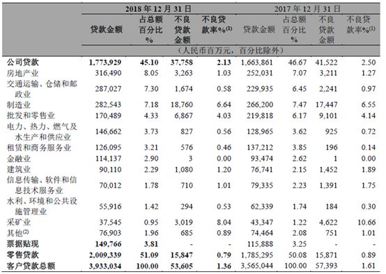 从细分产品类型上看,公司贷款的不良率从2017年的2.5%下降至2.13%,而零售贷款的不良率则从2017年的0.89%下降至0.79%。分行业看,除了租赁和商务服务业,水利、环境和公共设施管理业,制造业不良贷款率较年初分别上升0.32、0.23、0.09个百分点;其余行业不良贷款率较年初均下降。而零售贷款细项业务方面,小微贷款的不良率从2017年的1.77%下降至1.34%,住房按揭贷款不良率则从2017年的0.33%下降至0.28%,信用卡不良贷款率基本与上一年持平,为1.11%。